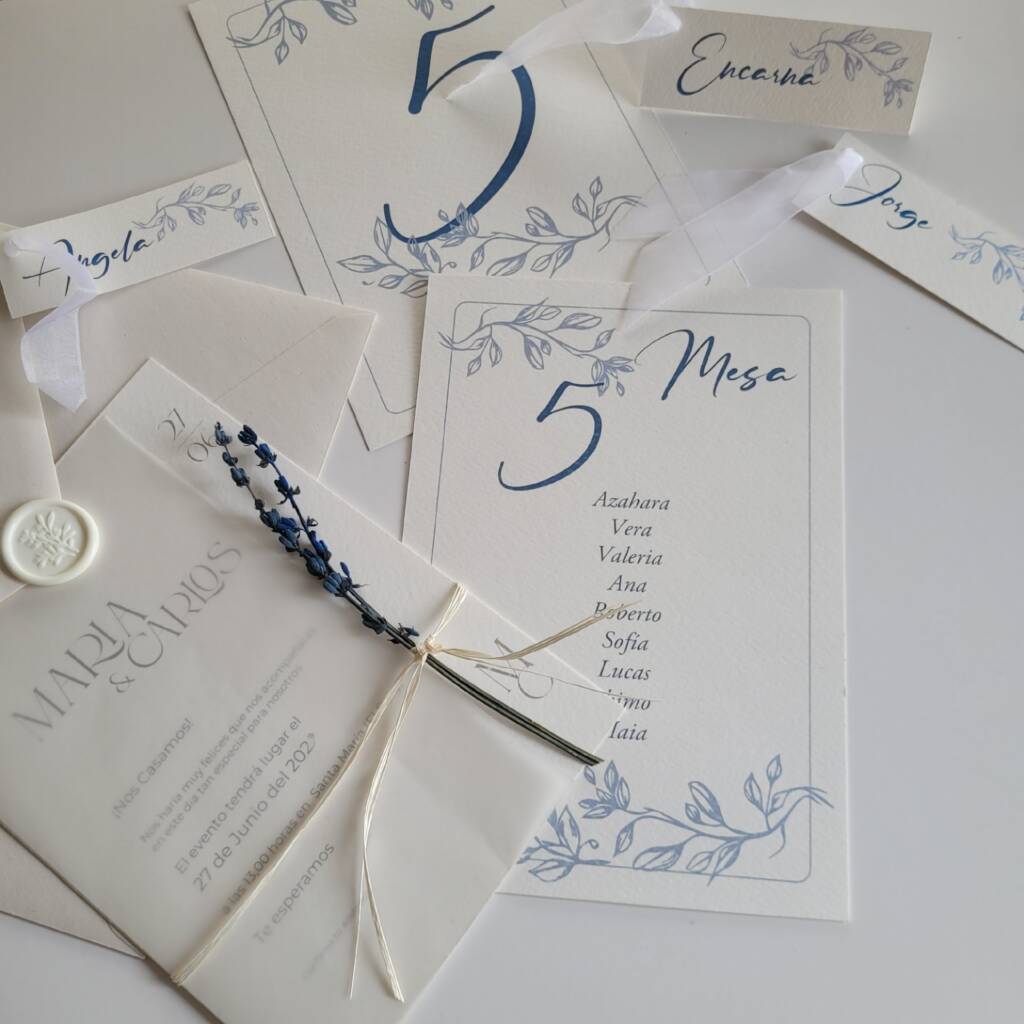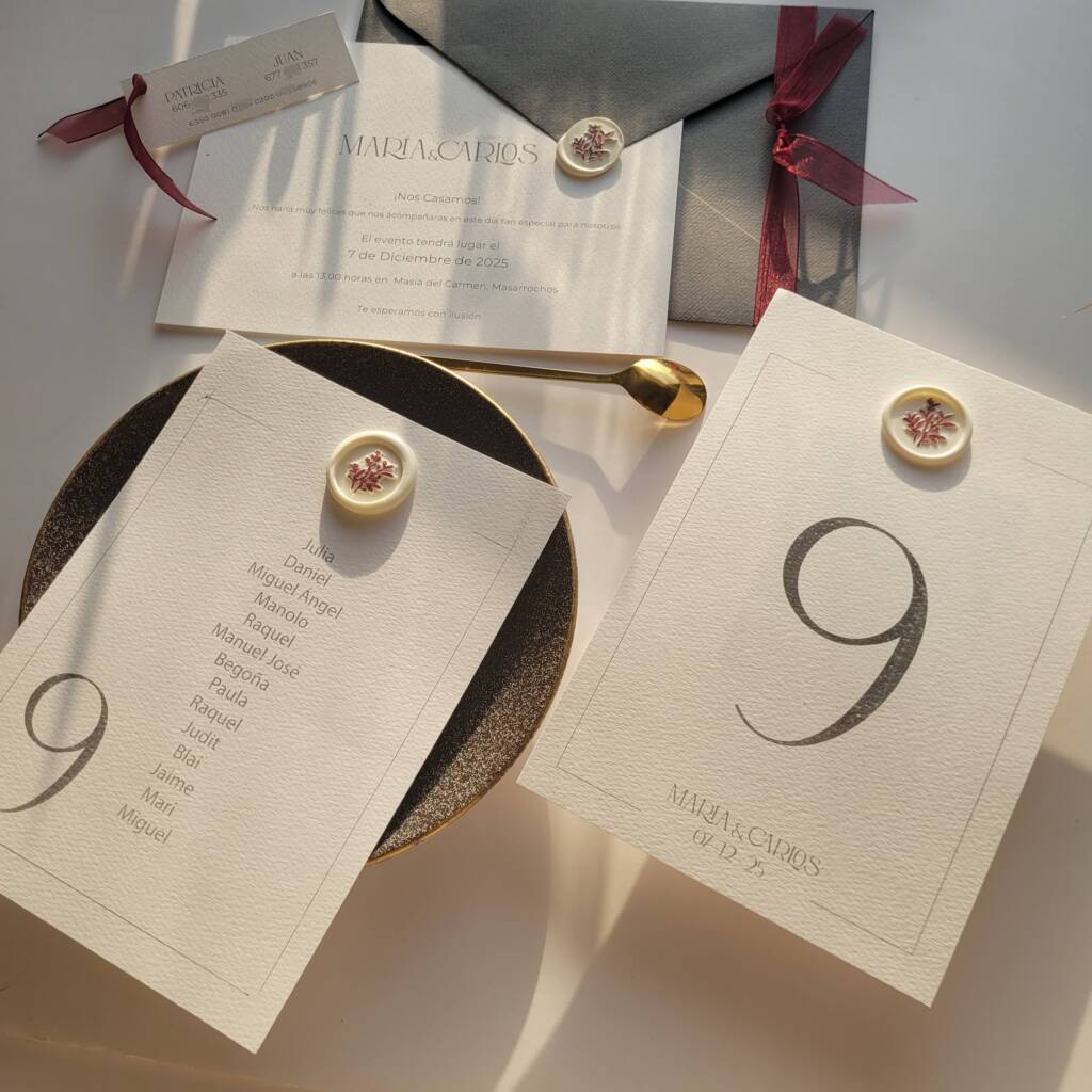 Podemos realizar la papelería a juego con tu invitación de boda. Tarjeta de agradecimiento, Minuta, Números de mesa, Seeting plan, Marcasitios, Etiquetas para detalles personalizados, Libro de Firmas…